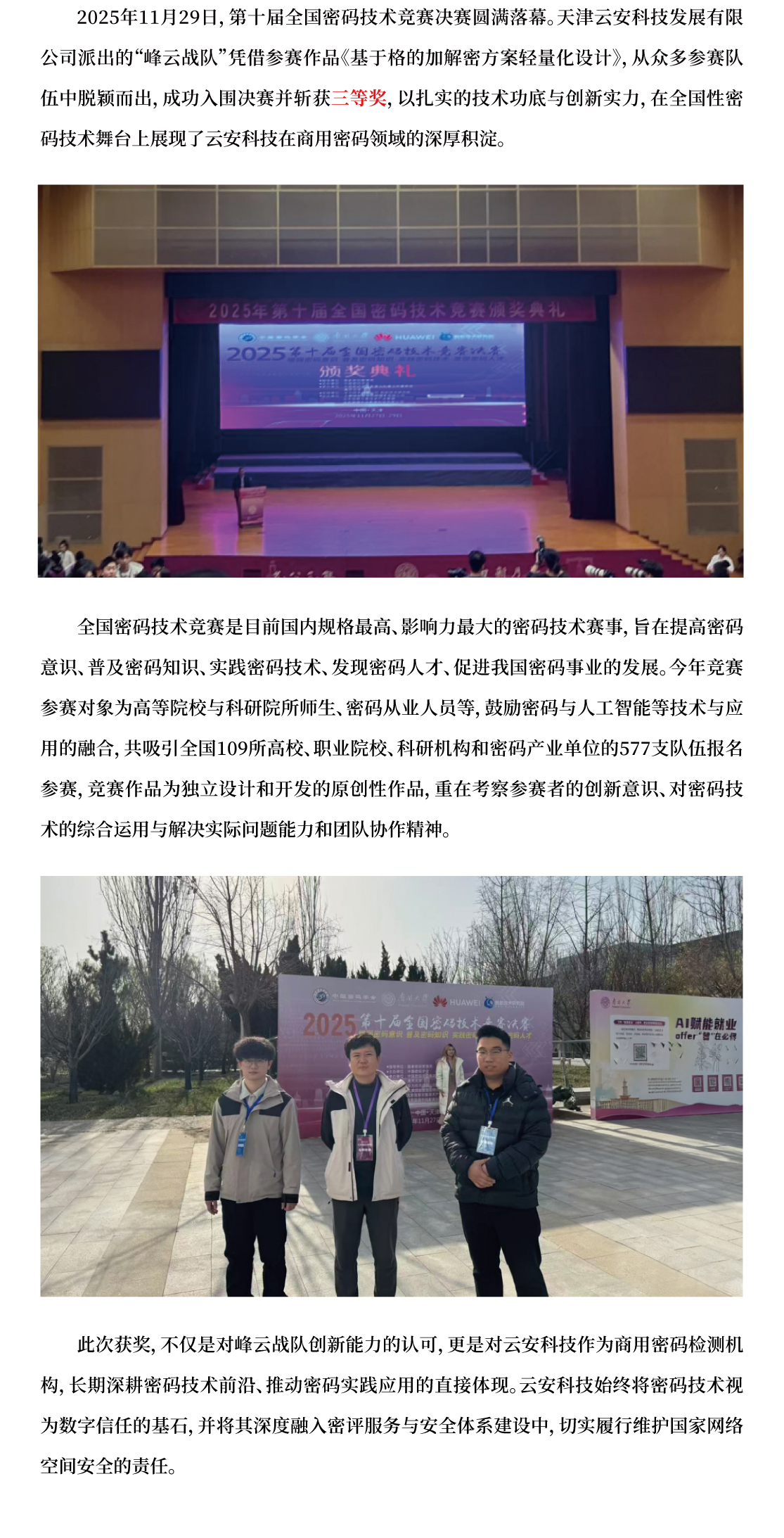 喜报!云安科技峰云战队荣获全国密码技术竞赛三等奖